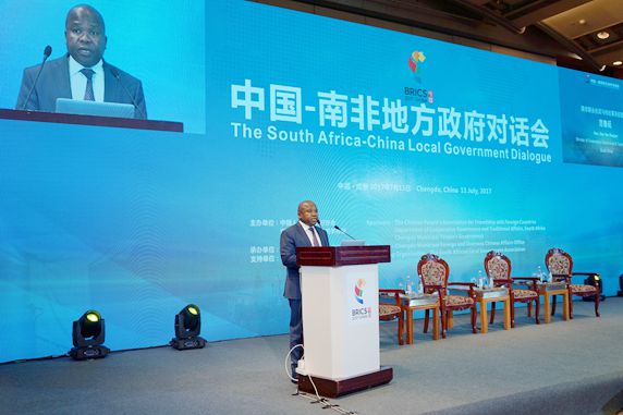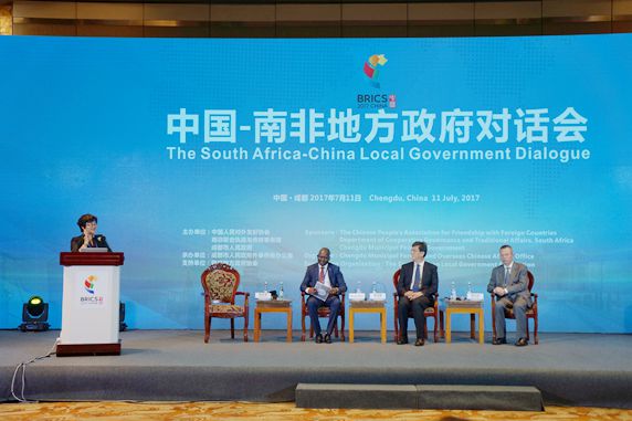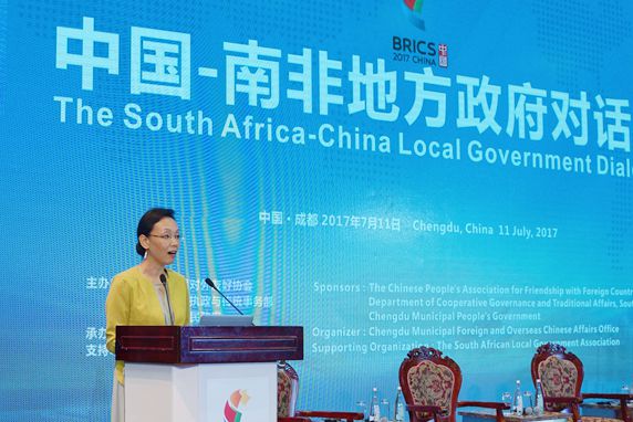 On July 11, the South Africa-China Local Government Dialogue, which was co-hosted by the CPAFFC, Department of Cooperative Governance and Traditional Affairs (COGTA) of South Africa and Chengdu Municipal Government, was successfully held in Chengdu, Sichuan Province. Mme. Lin Yi, Vice President of the CPAFFC, Hon. Des Van Rooyen, Minister of COGTA, Mme. Liu Xiaoliu, Vice Mayor of Chengdu Municipal Government and nearly 100 local government representatives from both countries attended the Dialogue.