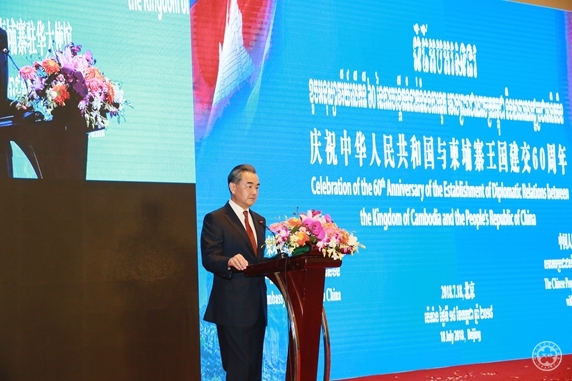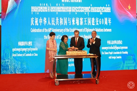 On July 18th, State Councilor and Foreign Minister Wang Yi attended the celebration reception co-hosted by the CPAFFC and the Royal Embassy of Cambodia to China for the 60th anniversary of the establishment of diplomatic relations between China and Cambodia . Wang Yi and the Cambodian ambassador, Mme. Khek M Caimealy, both spoke at the reception. Up to 300 people attended the event, including President EK Sam OL of Cambodia-China Friendship Association, President Li Xiaolin and Vice President Lin Yi of CPAFFC, friendly personnels of all trades from both nations, and foreign diplomatic envoys to China. Li Xiaolin hosted the reception.