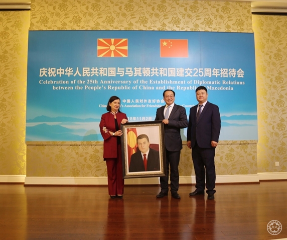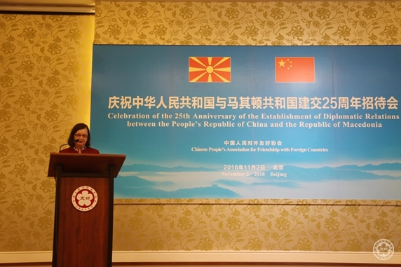 A reception to celebrate the 25th anniversary of the establishment of diplomatic relations between China and Macedonia was held by the Chinese People’s Association for Friendship with Foreign Countries (CPAFFC) in Beijing on Novermber 2, 2018. Mr. Song Jingwu, Vice President of CPAFFC and Mr. Zorica Tashkovska, Chargé d'Affaires a.i. of Macedonia Embassy in China, attended the activity and delivered speeches respectively.
