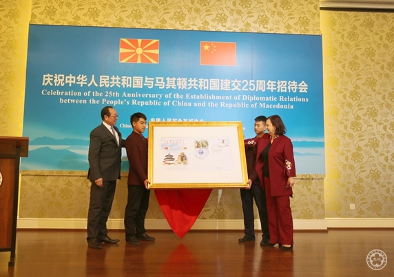 After addressing, Vice President Song Jingwu and Chargé d'Affaires a.i. Zorica Tashkovska jointly unveiled the commemorative envelope marking the 25th anniversary of the establishment of diplomatic ties of the two countries. Vice President Song Jingwu also presented the portrait of Gjorge IVANOV, Macedonia President, which was paited by painter Miao Jianzhong, to Macedonia Embassy in China.
