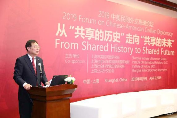 Vice President Xie Yuan attended and delivered a key-note speech at the 2019 Forum on Chinese-American Civilian Diplomacy, co-organized by Shanghai Institute of American Studies, Institute of International Relations and Institute of History of SASS, and Shanghai Public Diplomacy Association, in Shanghai on April 9.