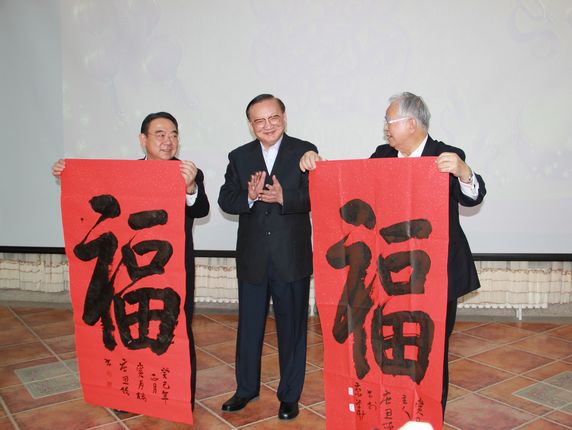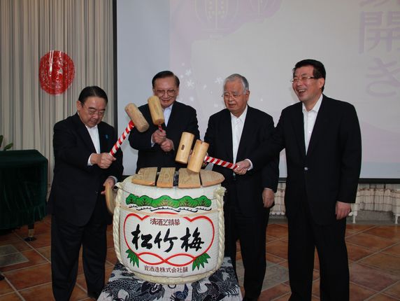 联谊会上,唐会长与两国各界人士亲切交谈,互致问候。他表示,中国民间各界将继续为两国关系改善发展做出不懈努力。当唐会长将中国书法家当场挥毫创作的“福”字条福赠送给米仓会长夫妇和木寺大使夫妇时,全场响起热烈掌声。唐会长还和井副会长、米仓会长、木寺大使共同执锤,行日本传统的打开清酒酒桶的“开镜”仪式,并落下“打年糕”第一锤。