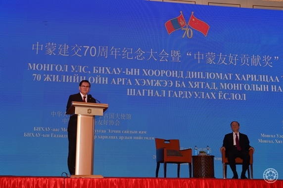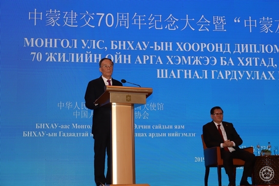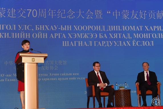 In his speech, Vice President Wang firstly, on behalf of the Chinese government, paid tribute and sent gratitude to personages from both countries in all walks of life who have cared and supported the China-Mongolia relations development for a long time. Vice President Wang said that China and Mongolia are good neighbors, good friends and good partners connected by mountains and rivers. The bilateral relations development is benefited by the careful cultivation and strategic guidance by the two countries’ leaders from generations, the joint promotion by friends in each social sectors with good neighborhood and friendship in mind, and the mutually beneficial and win-win cooperation in each field. Vice President Wang said that on the new historic starting point of 70th anniversary of diplomatic ties, the two sides should make concerted efforts to continuously enhance the political trust, deepen the synergy of OBOR and “Developing Road”of Mongolia, strengthen the people-to-people exchanges and jointly build the China-Mongolia community of shared future.
