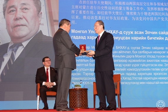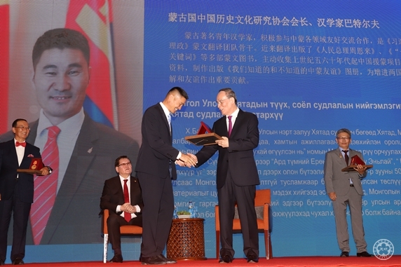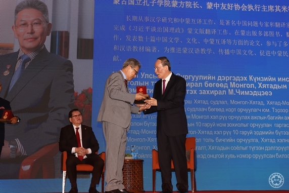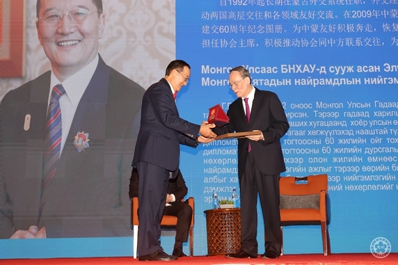 On the ceremony, Vice President Wang Qishan conferred the medals and certificates to the 4 awardees from Mongolia, namely, Mr. Batsukh, former Mongolian Ambassador to China and Chairman of Mongolia-China Friendship Association, Mr. Sukhbaatar, former Mongolian Ambassador to China and Secretary of Foreign Affairs of Mongolia Democratic Party, Mr. Chimidtseye, Mongolian president of Confucius Institute in Mongolia National University and Executive Chairman of Mongolia-China Friendship Association, Mr. Baatarkhuu, president of Mongolia Research Association on Chinese History and Culture and famous Mongolian sinologist. The China-Mongolia Friendship Award is set up by CPAFFC to honor the personages who have made long-term contribution and outstanding achievements in developing the bilateral relations and promoting the exchanges and cooperation.