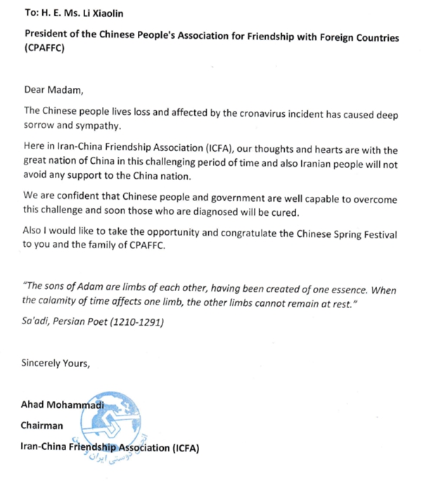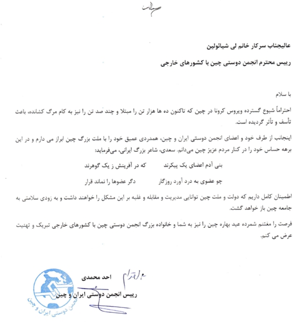 伊朗中国友好协会全体人员与伟大的中国人民心连心,携手共克时艰,伊朗人民愿不遗余力支持贵国。