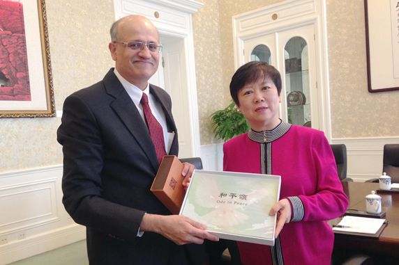 林怡副会长向顾凯杰大使介绍了我会即将举办的中印联合医疗队、中印论坛、国际瑜伽大会等活动,希望顾凯杰大使和印度驻华使馆支持我会的工作。
