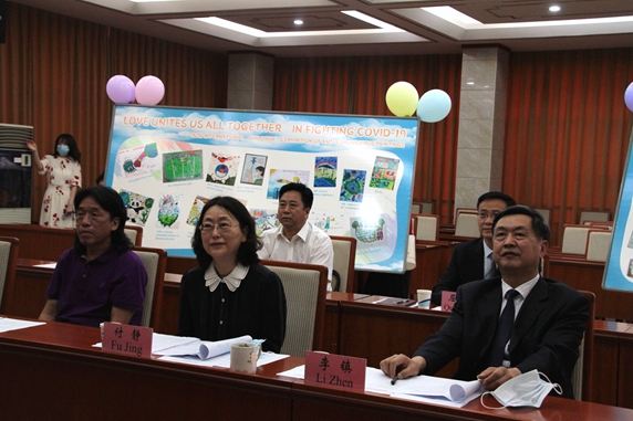 在活动现场,中外儿童代表拿起手中的画,向镜头对面的朋友们表达自己的想法。“我的这幅画叫《大战病毒》,希望和外国的小朋友们一起战胜病毒。”来自河南郑州文化路第一小学的齐蕙欣还邀请大家来河南:“等疫情结束后,希望你们都能来河南玩儿,到时候我给你们当导游!”