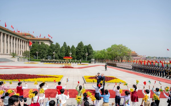 会谈前,习近平和夫人彭丽媛在人民大会堂东门外广场为阿利耶夫和夫人阿利耶娃举行欢迎仪式。